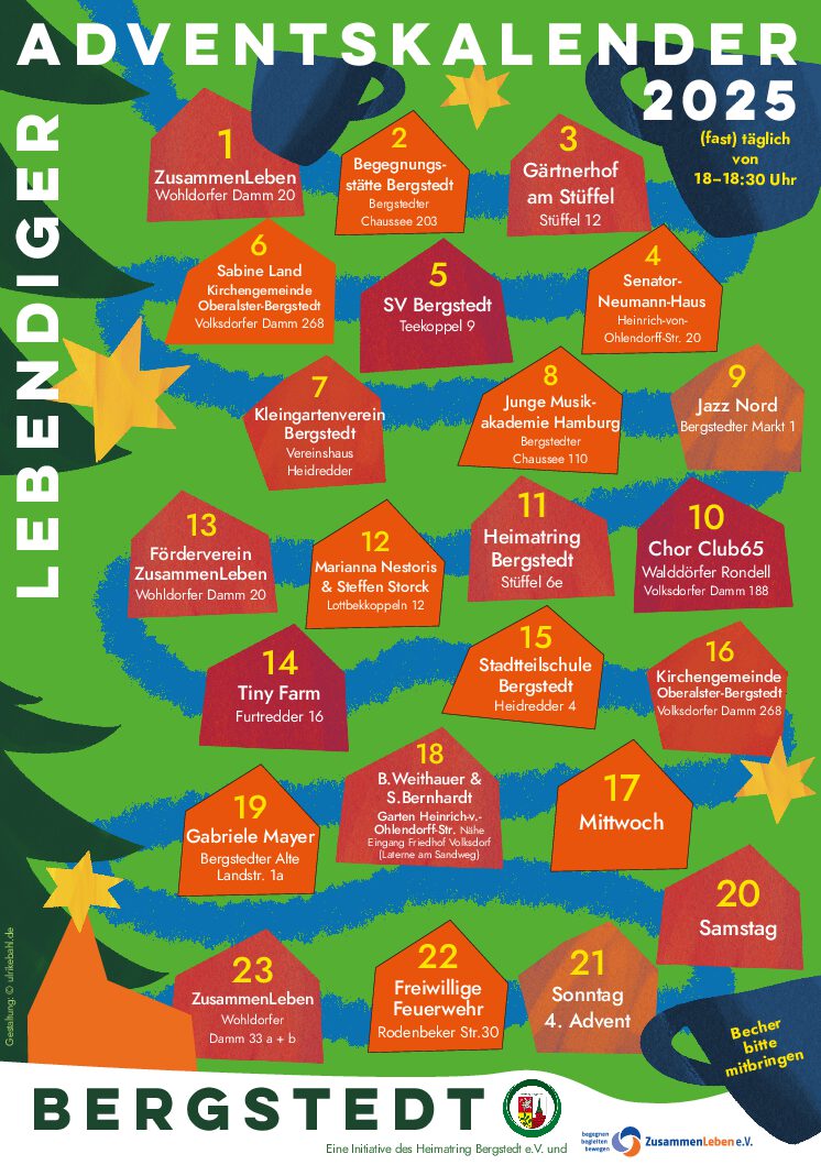 Viele Gastgeber haben sich bereit erklärt eine Zeit im Lebendigen Adventskalender zu gestalten. Seien Sie dabei und genießen von 18.00 bis 18.30 Uhr die gemeinsame Zeit mit Menschen aus Bergstedt! Auch Kinder sind herzlich willkommen!
